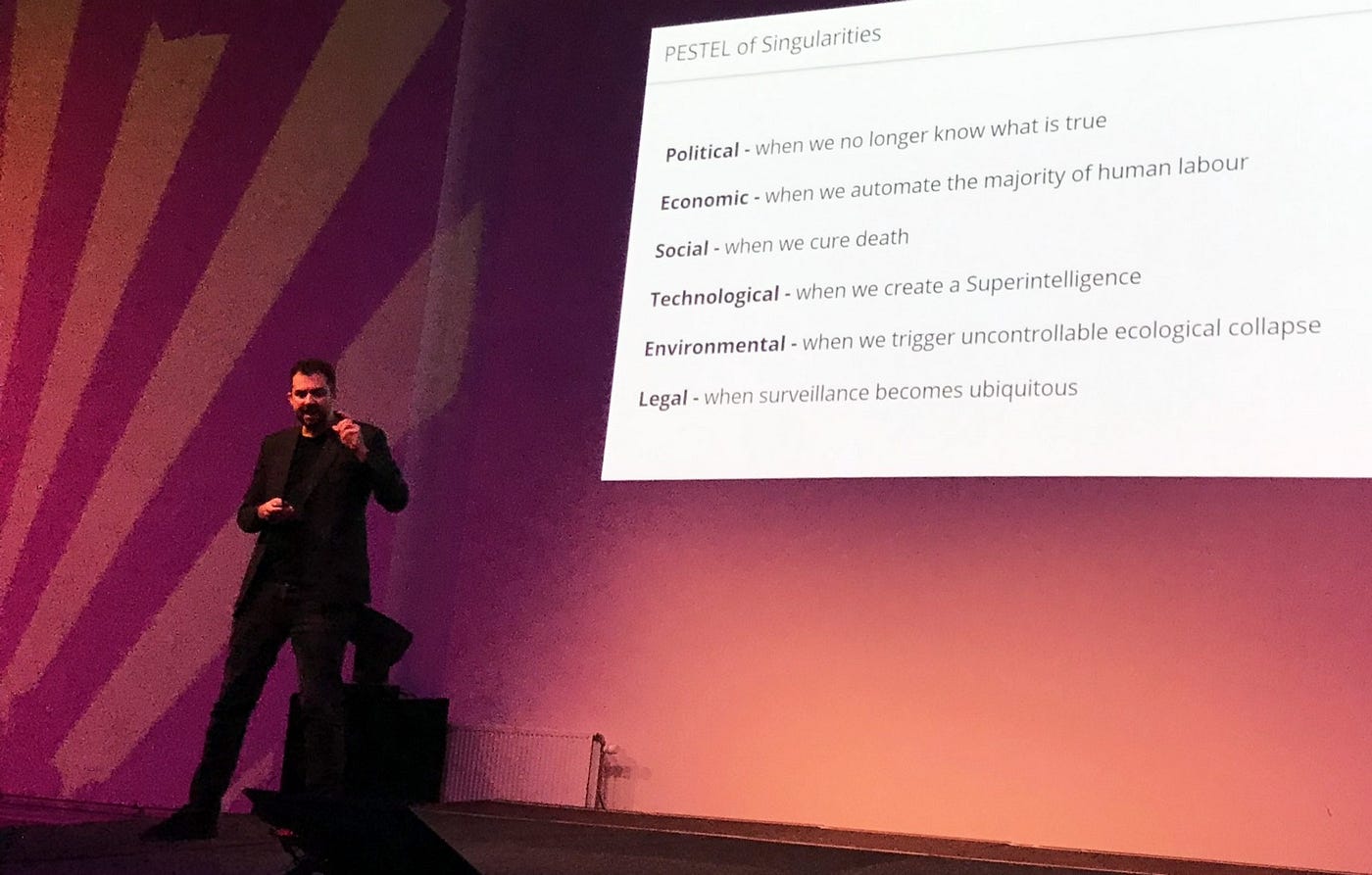 Daniel doesn’t stick to one singularity, he distinguishes six of them. He does this on the basis of the business analytic PESTEL model. That superintelligence is the technical singularity. He also sees a political, economic, social, environmental and legal singularity.